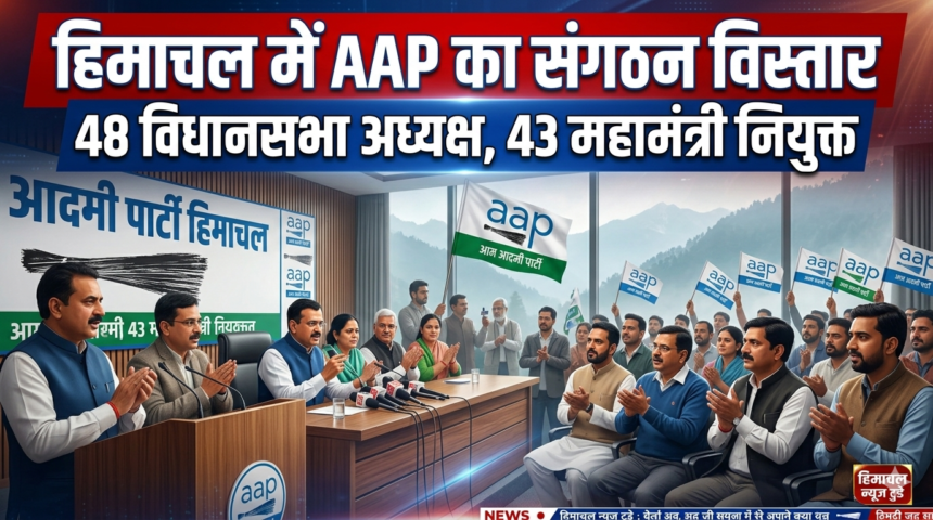 शिमला। हिमाचल प्रदेश में संगठन को मजबूत करने के लिए Aam Aadmi Party (AAP) ने बड़ा कदम उठाया है। पार्टी ने राज्य के विभिन्न विधानसभा क्षेत्रों में संगठनात्मक ढांचे को मजबूत करते हुए 48 विधानसभा अध्यक्ष और 43 विधानसभा महामंत्री नियुक्त किए हैं। इसके साथ ही चार नेताओं को प्रदेश सह-प्रभारी की जिम्मेदारी भी सौंपी गई है।