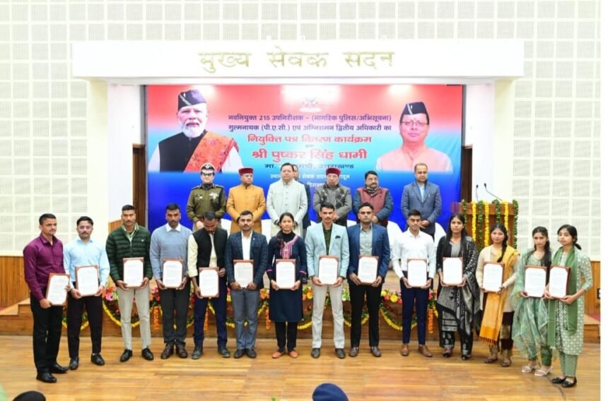 देहरादून। मुख्यमंत्री पुष्कर सिंह धामी ने बुधवार को मुख्यमंत्री कैंप कार्यालय स्थित मुख्य सेवक सदन में 215 नवनियुक्त उपनिरीक्षकों को नियुक्ति पत्र प्रदान किए। इनमें 104 उपनिरीक्षक, 88 गुल्मनायक (पीएसी) और 23 अग्निशमन द्वितीय अधिकारी शामिल हैं।
